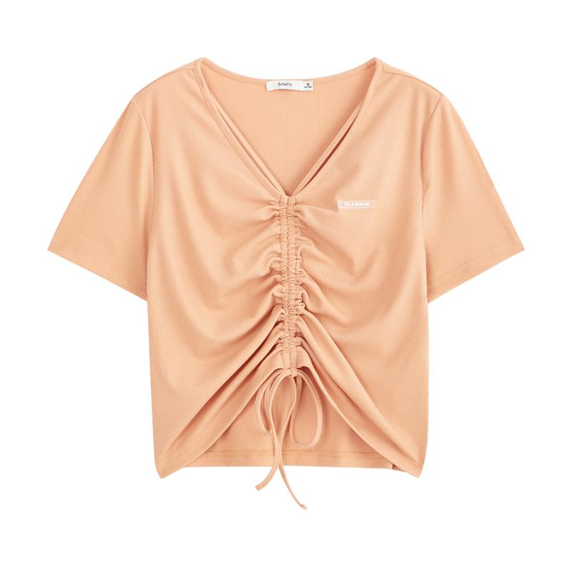 三福短袖T恤2023夏季新设计感小镂空抽绳修身纯色V领短款上衣女装满60.0元减30.0元
